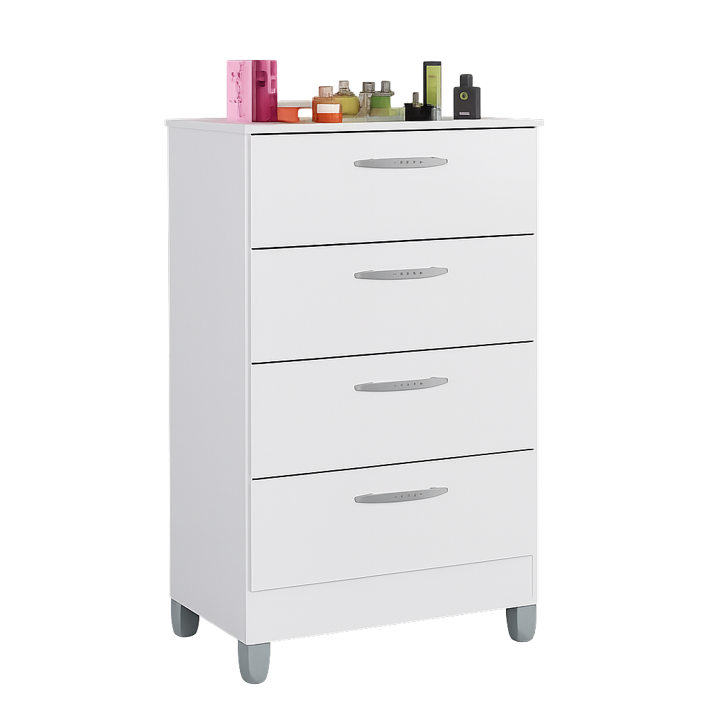Suas quatro gavetas proporcionam amplo espaço para organizar roupas, acessórios e objetos pessoais, mantendo tudo ao alcance das mãos. A estrutura resistente garante durabilidade e segurança, tornando a cômoda funcional e prática no dia a dia.