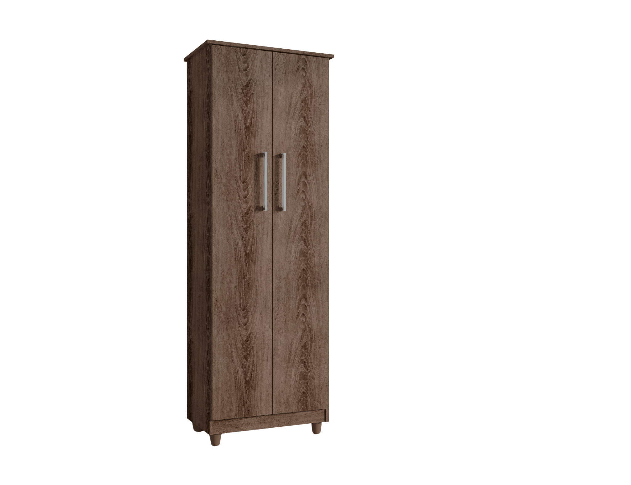 O armário possui duas portas e prateleiras internas, permitindo armazenar utensílios, roupas, mantimentos ou objetos pessoais de forma organizada. Seu design compacto e resistente otimiza espaços, mantendo o ambiente funcional e bem decorado.