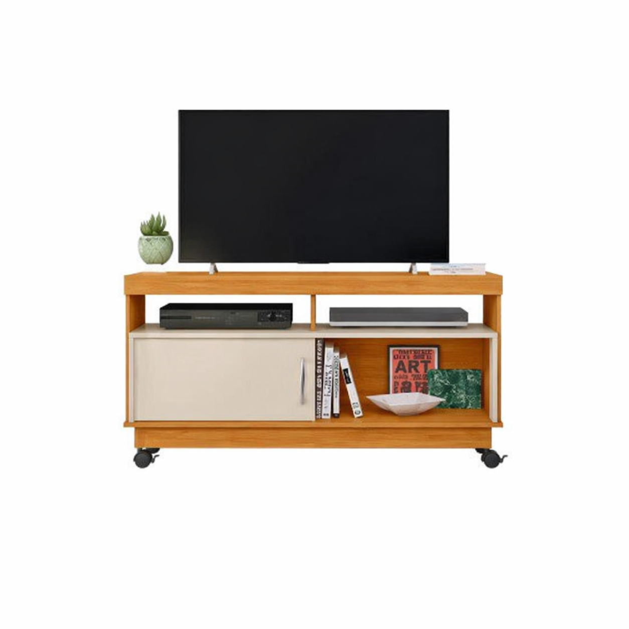 Seu tampo espaçoso suporta TVs e itens decorativos com segurança, enquanto os rodízios garantem mobilidade e facilitam a limpeza do ambiente.