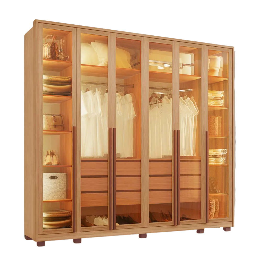 Com amplo espaço interno, o roupeiro conta com cabideiros resistentes, prateleiras bem distribuídas e gavetas espaçosas, ideais para manter roupas, acessórios e calçados sempre organizados. As seis portas garantem fácil acesso e melhor divisão dos itens.