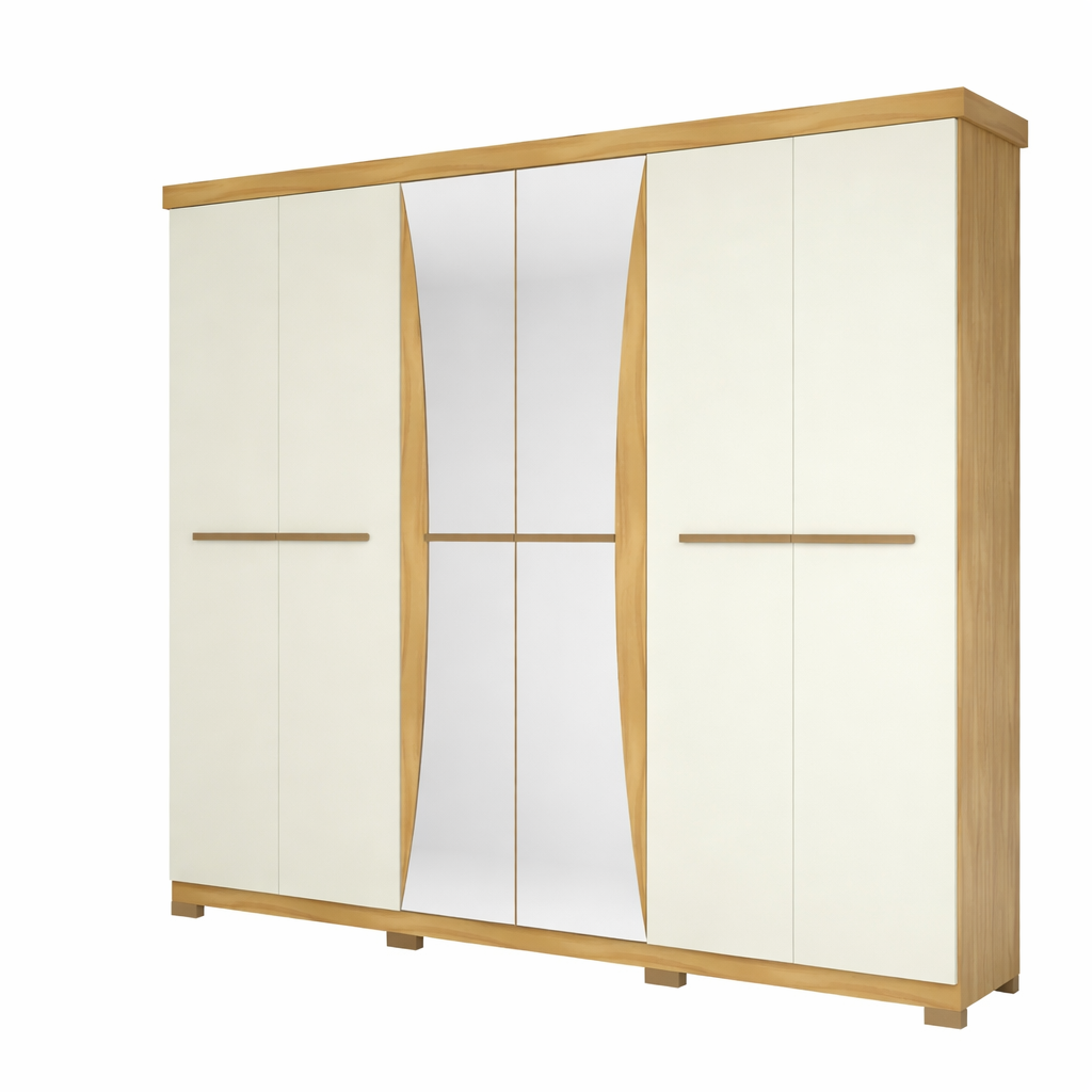 O modelo conta com 6 portas e espelho integrado, trazendo mais praticidade ao dia a dia e ajudando a ampliar visualmente o ambiente. Seu interior é bem distribuído, com cabideiros e prateleiras, permitindo organizar roupas, acessórios, calçados e roupas de cama de forma eficiente.