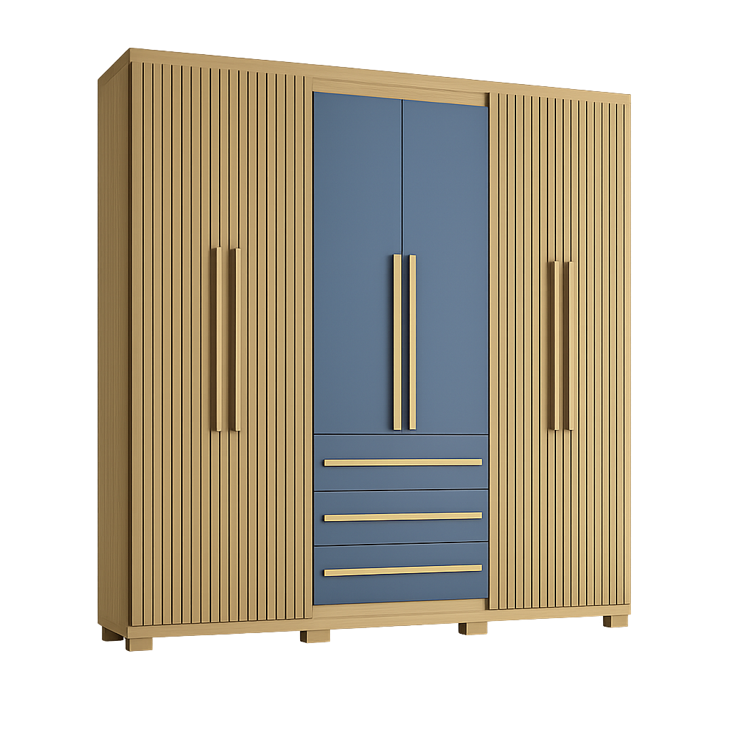 O Roupeiro Valencia 6 Portas é a escolha ideal para quem busca amplo espaço interno, organização e design moderno. Com um visual elegante que combina ripado amadeirado com portas centrais na cor cinza, ele traz sofisticação ao quarto e combina facilmente com diversos estilos de decoração.